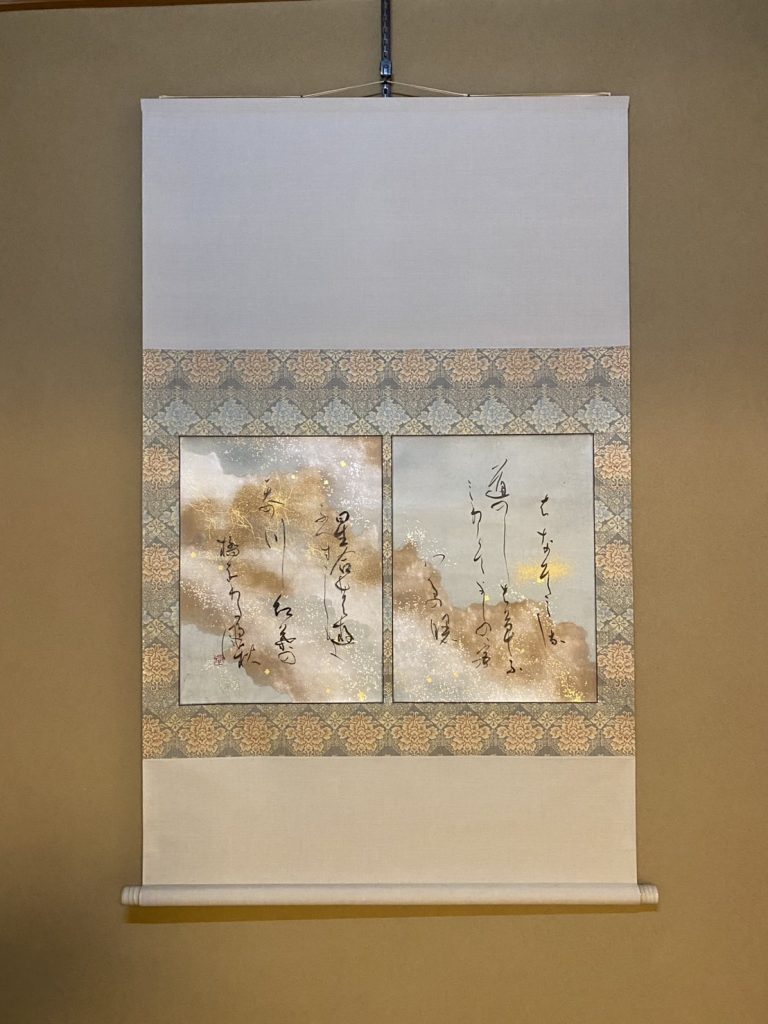 今ではとても希少となってしまった美しい料紙に春と秋の歌が掛かり、茶室はえもいわれぬ気品が漂います。