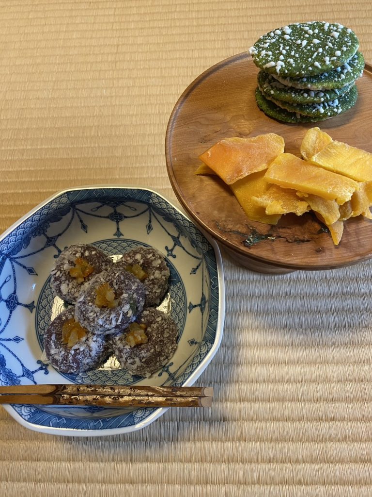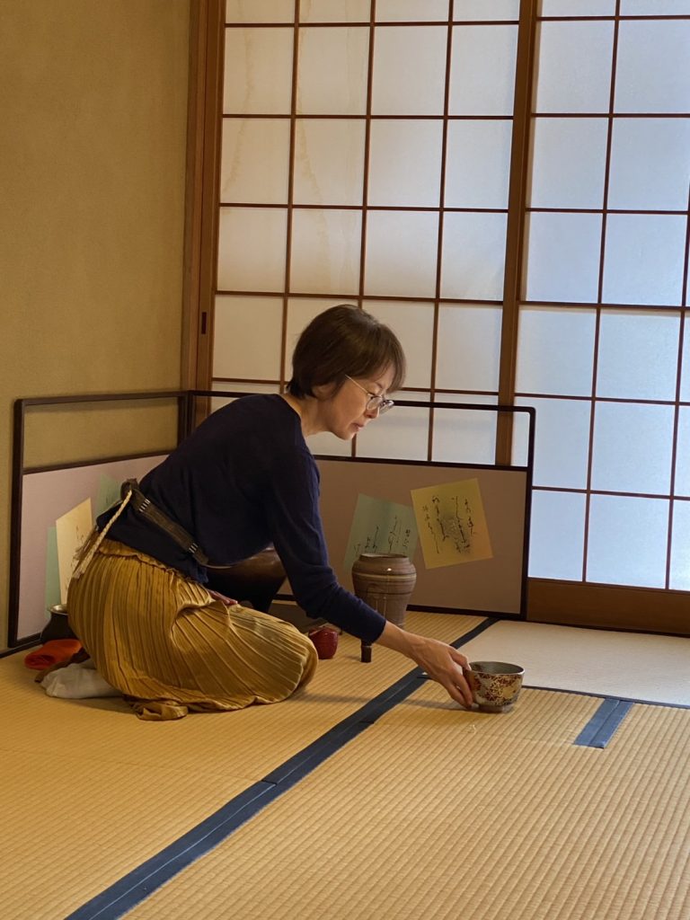 社中のお楽しみ、主菓子は抹茶餡を紅芋の生地でつつんだもの。見た目の美しさ、口の中で堪能する楽しさ、干菓子とのハーモニー、考え抜かれた組み合わせに感服するばかりです。