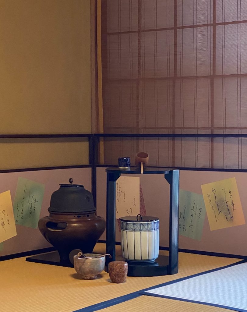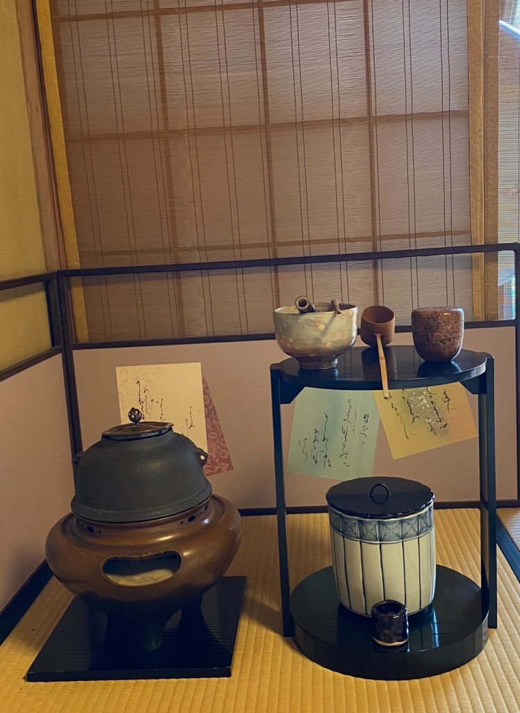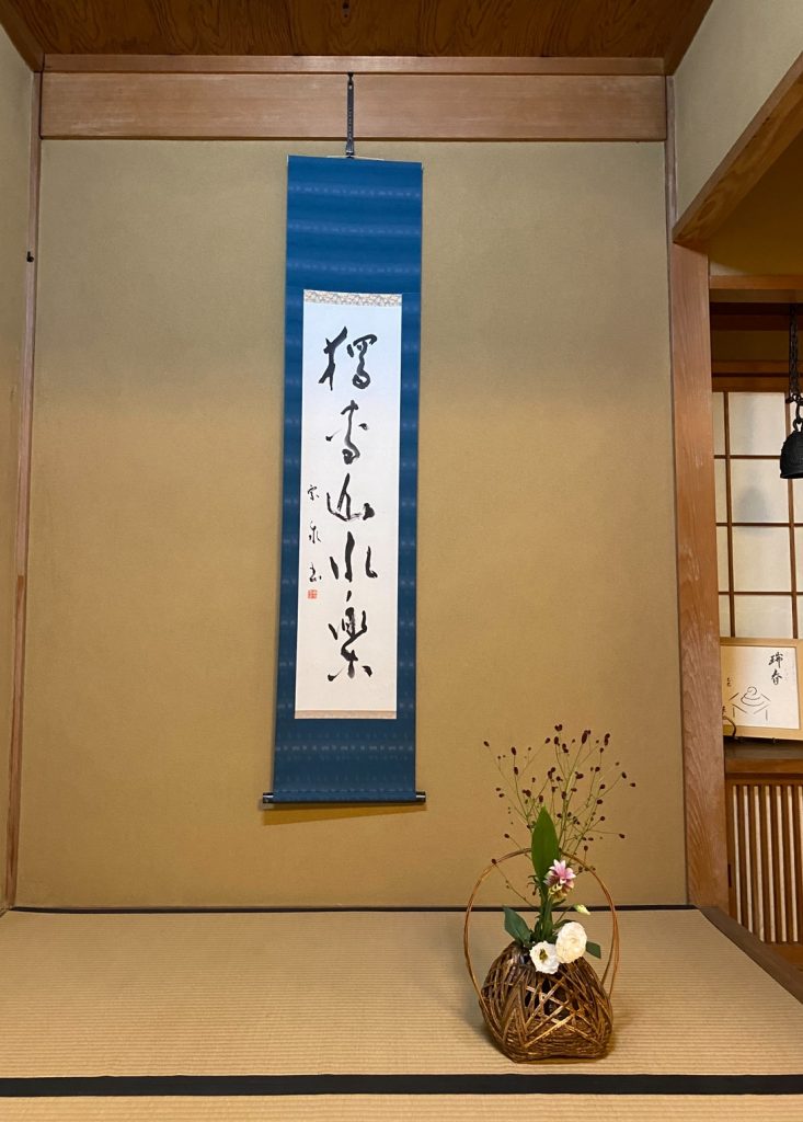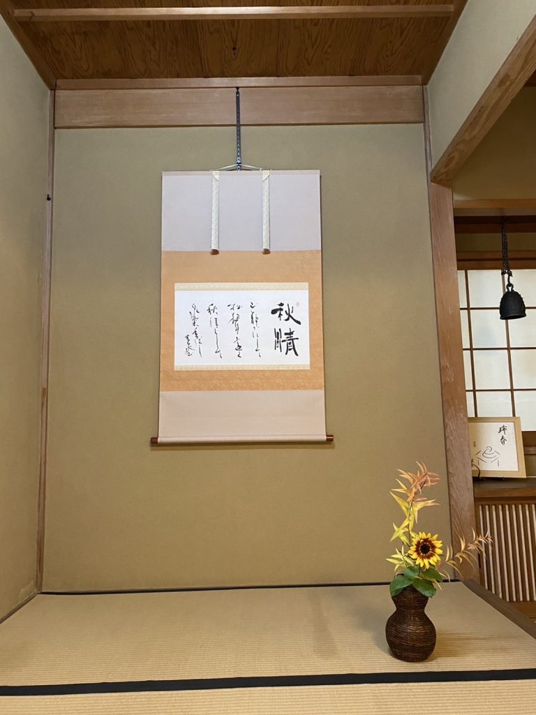 今ではとても希少となってしまった美しい料紙に春と秋の歌が掛かり、茶室はえもいわれぬ気品が漂います。
