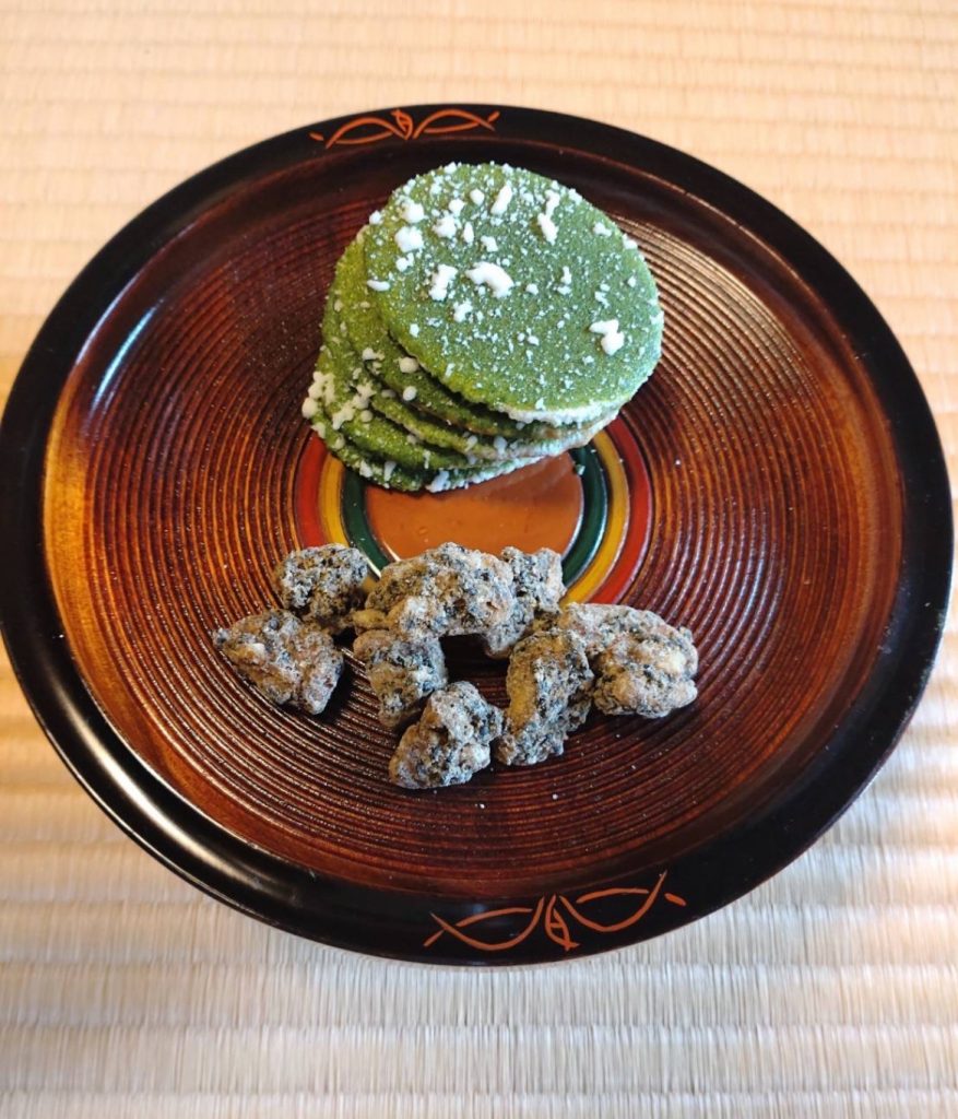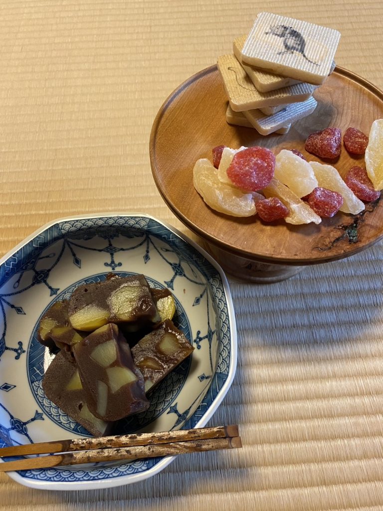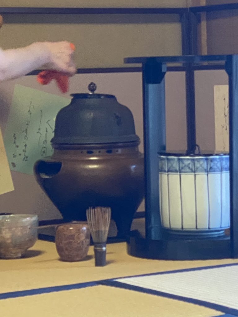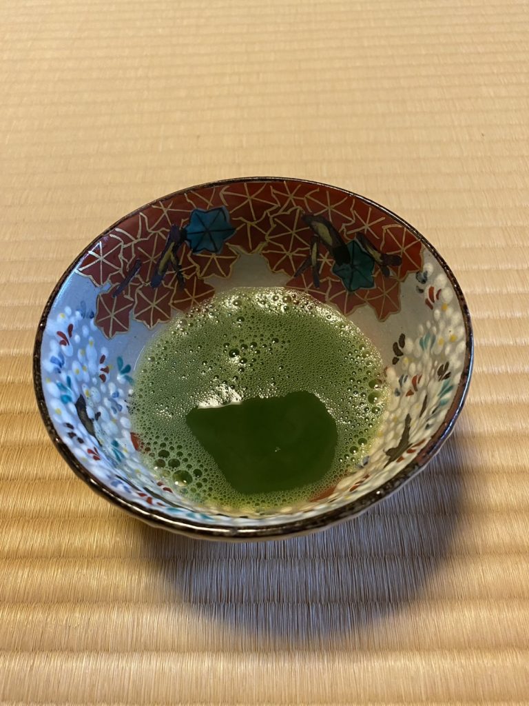 社中のお楽しみ、主菓子は抹茶餡を紅芋の生地でつつんだもの。見た目の美しさ、口の中で堪能する楽しさ、干菓子とのハーモニー、考え抜かれた組み合わせに感服するばかりです。
