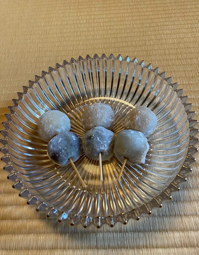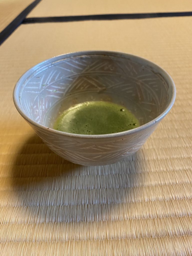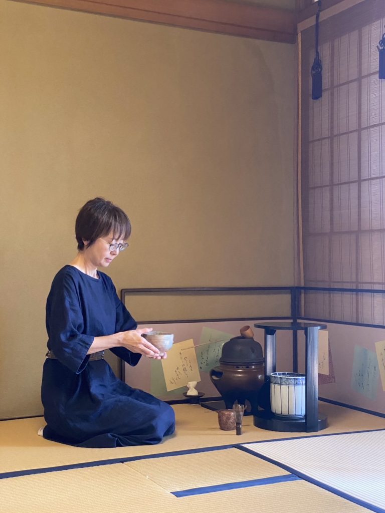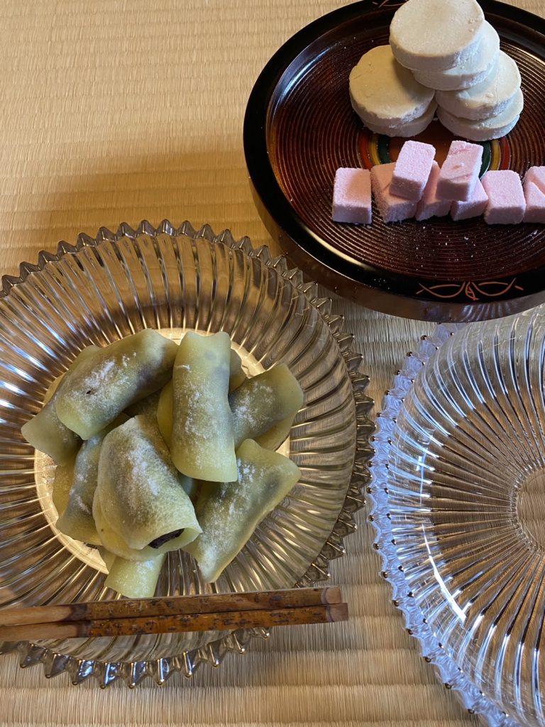 社中のお楽しみ、主菓子は抹茶餡を紅芋の生地でつつんだもの。見た目の美しさ、口の中で堪能する楽しさ、干菓子とのハーモニー、考え抜かれた組み合わせに感服するばかりです。